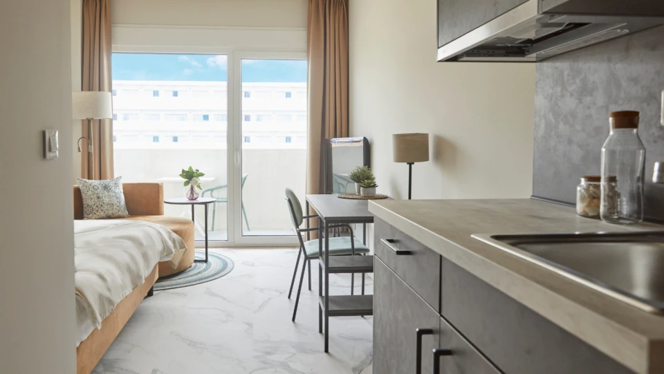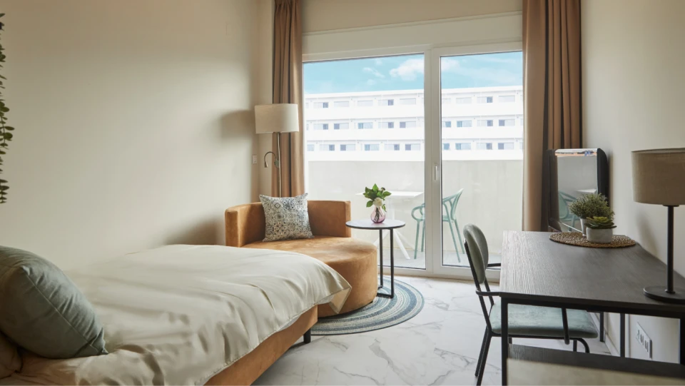 The interior, designed in collaboration with De Arend – Project & Horeca includes items and materials which fit our brand and the Spanish environment. This creates a calm and inspiring place to live for future residents to rock their full potential.