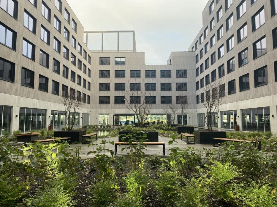 While students are already staying in the Amsterdam Minervahaven complex, a final touch is made to the garden. With the arrival of a number of tall Amelanchier lamarckii’s, the garden is as good as finished. The trees had to be lifted over the building by a crane, which means that placing these trees was literally the highlight of the morning.